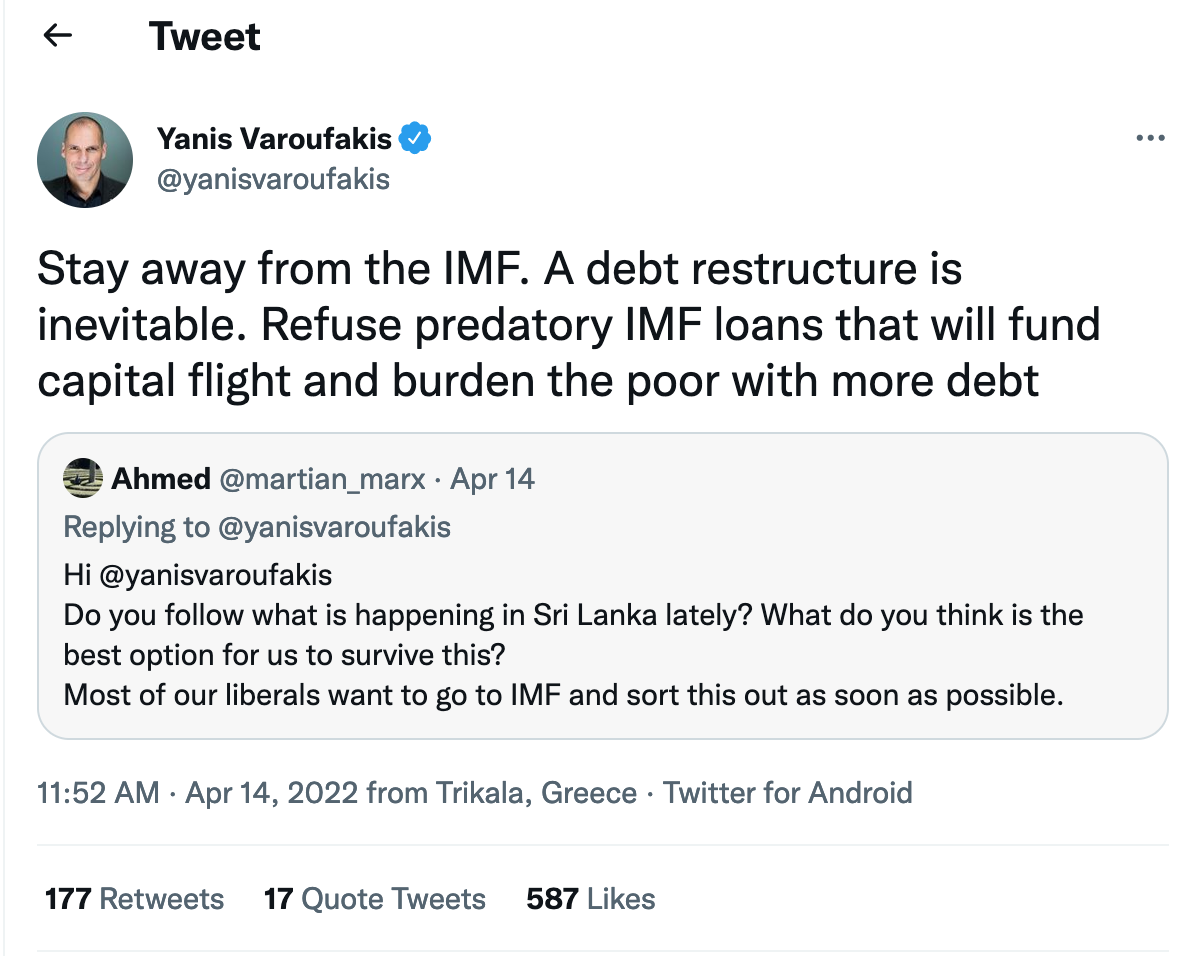 “….ශ්රී ලංකාවේ ප්රභූන්ට අවශ්ය වූයේ ශ්රී ලංකාව සිංගප්පූරුවක් කිරීමට වුවද අද වන විට ජනයාගේ එදා වේල සපයා ගැනීමට රට සිඟමන් යදින තත්වයකට පත්ව තිබේ. මෙය පාලක ස්ථාපිතය සසල කරන ජාතික නින්දාවකි. එසේ තිබියදී, අසීමිත ආනයන සහ තව තවත් අතමාරු කරගෙන ණය දික් කර ගැනීමේ විනාශකාරී මග ගැනීමෙන් කිසි පාඩමක් ඉගෙන නොගත් බව හඟවමින්, රට එම වට්ටෝරුගත ප්රතිකර්මයන්ම නැවත වරක් තෝරා ගනිමින් තිබේ. සැබැවින්ම ණය පැහැර හැරීමට සහ ආණ්ඩුවේ දැන් ප්රධාන ප්රතිචාරය වී ඇති ජා.මූ.අ. ගිවිසුමක් තුළින් ණය ප්රතිව්යුහගත කිරීම ට තල්ලු කිරීම සම්බන්ධයෙන් කොළඹ ඉහළ පෙළේ ආර්ථික බක්කන් තමන් ගැනම තරමක් සතුටු වූ බව පෙනේ. පාලන තන්ත්රය පලවා හැරීමේ විරෝධතාවලින් පිරුණ සුවිශාල කැළඹීම මධ්යයෙහි, රජයට එරෙහි ප්රභූන්, උපරිම වශයෙන් ඩොලර් බිලියන කිහිපයක් කෙටි කලකදී ගෙන ආ හැකි ජා.මූ.අ. පැකේජයකින් ඔබ්බට බරපතළ ආර්ථික විකල්පයක් නොමැතිව, මූලික වශයෙන් කල්පනා කරමින් සිටින්නේ ව්යවස්ථාමය සහ නෛතික විසඳුම් පිළිබඳව ය….”