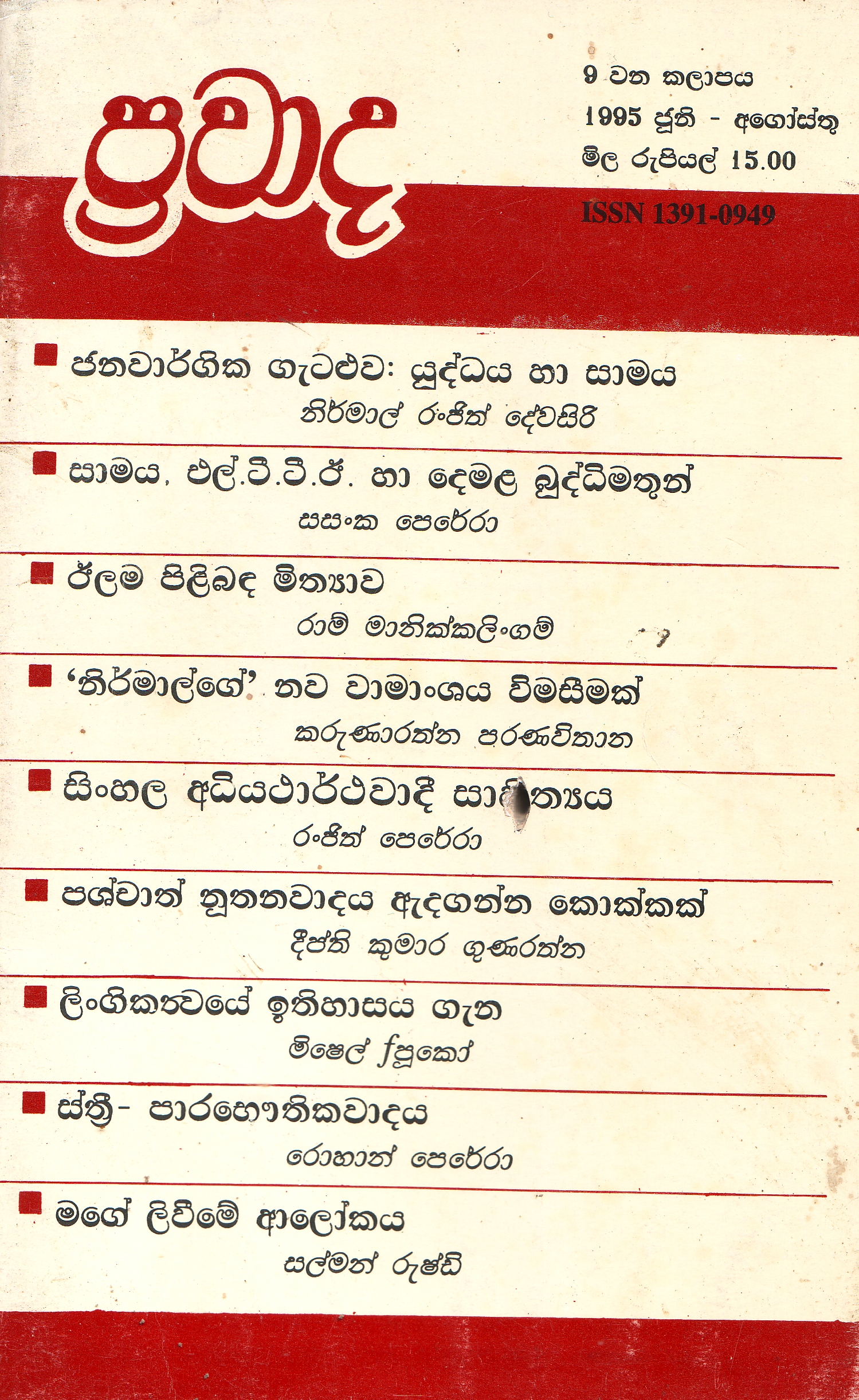 පශ්චාත් නූතනවාදය මොකාටද එන්නේ? – දෙවන කොටසමේ ආදී වශයෙන් උදාහරණ විශාල ප්රමාණයක් තියෙනවා. නමුත් ඊට වඩා ප්රායෝගිකයි මම මේ දැන් කියපු දේවල්. ඒ අවදානමත් අභියෝගයක්, එහි වැදගත් කමත් අපට දකින්න පුළුවන් දීප්තිගේ ලිපි දෙක පොඩ්ඩක් පරීක්ෂා කලොත්. නමුත් මම මුලදි කිව යුතු දෙයක් තියනවා. මම හිතන්නේ දීප්ති විතරයි මේ සංකල්ප තුළින් (විශේෂයෙන්ම නූතනවාදී සංකල්ප) අපිට අදාළ යථාර්ථය තේරුම් ගැණීමට හෝ ඊට එරෙහි වීමට යම්කිසි විදිහේ ප්රයත්නයක් දරන්නේ. දීප්තිගේ මෙම සාර්ථක අසාර්ථක මධ්යයේ (Nexus) අපට එය දකින්නට පුලුවන්. අනෙක් අයගේ මැදිහත් වීම්වල ප්රයෝජනයක් නැහැ. මොකද බොහෝ විට බොරුවක් කරලා තියෙන්නේ. මන්ද එකක් අරගෙන කොකිස් අච්චුවෙන් වගේ කොකිස් හදලා තියෙනවා. දීප්ති විතරයි මේ සංකල්ප තුළින් ඇත්තෙන්ම අලුත් දෙයක් ලබා ගන්න උත්සාහ කරලා තිබෙන්නේ. මම මෙතනදි විශේෂයෙන්ම සඳහන් කරන්නේ ප්රවාද 8 හා 9 කළාපවල පළ වූ ලිපි දෙක ගැනයි.දීප්තිගේ මෙම ලිපි දෙකටත් වඩා ඉතාම පුහුයි, බොළඳයි ප්රවාද කතුවැකිය. මෙම කතුවැකියෙන් පශ්චාත් නූතනවාදය ගැන කථා කරනවා. ඒකෙන් කරන්නේ මුලදි අපි කථා කලා වගේ, නම් දාන එකයි. අපට ඉතාම වැදගත් වන්නේ මේ ප්රායෝගික දෙයයි. එනිසා මා මෙය කියවන්නම්. “මෙවර ප්රවාද සඟරාවෙන් අපට ප්රධාන වශයෙන් ඉදිරිපත් කරන්නේ පශ්චාත් නූතනවාදය යැයි හැඳින්වෙන සමාජ න්යාය ආශ්රය කොටගෙන සැකසුනු විග්රහයන් කීපයකි.” කවුද මේ කථා කරන “අප”, “එනම් සාම්ප්රදායික න්යාය ප්රවේශයන් හා විග්රහයන් වෙතින් අප ලබා ඇති බුද්ධිම සැප පහසුකම පශ්චාත් නූතනවාදය විසින් ඉතා දැඩි ලෙස ප්රශ්න කරනු ලබන හෙයිනි”. මේ “අප” යි මුලින් “අප” යි මට හිතෙන්නේ වෙනස්. මෙහි අන්තිමට කථා කරනවා “පශ්චාත් මාක්ස්වාදය, ස්ත්රීවාදය, පශ්චාත් ව්යුහවාදය යනාදී සංකල්ප මෙන්ම ලුවී අල්තුසර්, මිෂෙල් ෆුකෝ, ලියොතාද්, උම්බර්ටෝ ඊකෝ වැනි පුද්ගල නම් ද අපට දැන් හුරුපුරුදු ඒවාය”. කවුද මේ “අප” මම නම් දන්නේ නෑ. ඇත්තෙන්ම මම දකින්නේ මේ “පශ්චාත් නූතනවාදී යකා” කියන තැන ඉඳල ඒ වෙනුවට “පශ්චාත් නූතනවාදී දෙවියෙක්” බිහි කරනවා මෙතන. මෙ පශ්චාත් නූතනවාදී දෙවියාට පුළුවන්ලු පශ්චාත් මාක්ස්වාදය, ස්ත්රීවාදය, පශ්චාත් ව්යුහවාදය දැඩි ලෙස ප්රශ්න කරන්න. ඒ සියල්ල ඈඳී තිබෙන්නේ එක්තරා විශේෂ නූලකිනි. ලුවී අල්තුසර්, මිෂෙල් ෆුකෝ, ලියොතාද් කොහෙ නූල්ද මේවා. ඇත්ත වශයෙන්ම මම කියන්නෙ මෙතන තියෙන්නේ දන්න නම් ටික යොදා පෙන්වීමක් (Name dropping). මම දන්නවා ඒ නම් ටික. නමුත් දීප්ති ලඟ මේ වගේ වැඩ නැහැ. බලන්න මෙතන කියනවා “යුරෝපීය පශ්චාද් ප්රබුද්ධවාදී බුද්ධිමය ව්යාපෘතිය වූ ධනේශ්වර සමාජ න්යාය මෙන්ම මාක්ස්වාදය විසින් සංකල්පගත කරනු ලබන ප්රගතිය හා නවීනත්වය පිළිබඳ ඓතිහාසික දෘෂ්ඨිපතය විසංයෝජනය කිරීම හා එම දෘෂ්ඨිපතයම ප්රශ්න කිරීම පශ්චාත්