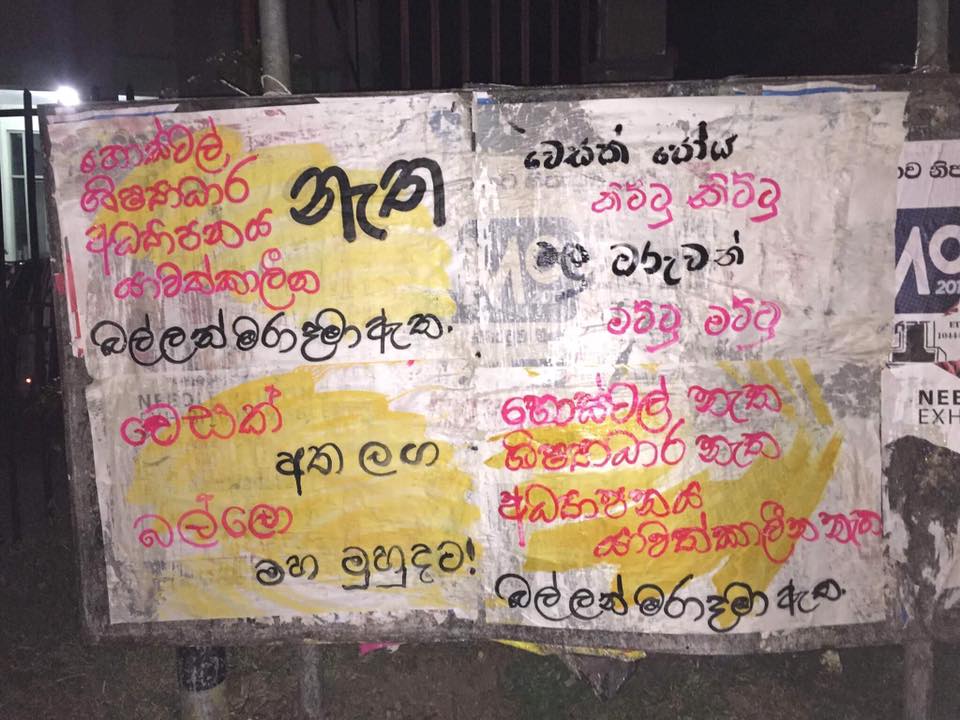 පසුගිය අප්රේල් 8, 9 දිනවල ශ්රී ජයවර්ධනපුර විශ්ව විද්යාලයේ ( http://www.sjp.ac.lk/ ) සිදු වූ නින්දනීය, අමානුෂික ක්රියාවලිය සිත්හි ඇති කළේ දැඩි කම්පනයකි. හඬක් නැඟිය නොහැකි ඒ අසරණයන් වෙනුවෙන් විශාල පිරිසක් ඉදිරිපත් විය. ඔවුන්ගේ ජිවත් වීමේ අයිතිය වෙනුවෙන් පෙනී සිටියහ. මේ විශ්ව විද්යාල පරිශ්රය තුළ ජිවත් වූ බල්ලන් තිහකට අධික ප්රමාණයක් හිංසනීය ලෙස සහ අභිරහස් ලෙස අතුරුදහන් කරවීමේ ක්රියාවලිය සම්බන්ධයෙනි. විශ්ව විද්යාල උපකුලපති විසින් නඟන චෝදනා පදනම් විරහිත බවත්, හුදෙක් සත්ත්ව විරෝධී ආකල්ප බවත් සඳහන් කළ යුතුය. මෙහිදී සත්ත්ව කරුණාව සහ අනුකම්පාව ඇති බහුතරයකගේ හඬ නොසලකා ඇති බවත් පෙනී යන්නේය. එබැවින් ඔවුන්ගේ හඬටද ඉඩක් දිය යුතු යැයි තරයේ විශ්වාස කරන්නෙමු. විශ්ව විද්යාලය තුළ උද්ගත වූ තත්ත්වය ඇත්ත වශයෙන්ම සත්ත්ව විරෝධී, පරිසර විරෝධී සහ වෛරය මුල් කරගත් පිරිසකගේ පටු ආත්මාර්ථකාමී අදහස් ක්රියාවට නැඟීමකි. මෙතෙක් කල් නිදහසේ ජිවත් වූ බල්ලන් පිරිසක් එක්වරම ඔවුන්ගේ වාසස්ථාන වලින් අමානුෂික ලෙස ඉවත් කොට අතුරුදහන් කොට සති දෙකකුත් ඉක්මවයි. මනුෂ්යත්වය අගයන කිසිවෙකුත් හෝ මේ ක්රියාව අනුමත නොකරන බව විශ්වාසයි. මෙය හුදු විශ්ව විද්යාලයේ සිදුවීමක්ම නොව සමස්ථ රට පුරාම ක්රියාත්මක කිරීමට නියමිත මෙන්ම ක්රියාත්මක වන ‘බල්ලන් මර්ධනය’ කිරීමේ අමානුෂික ක්රියාවලි ජාලයේ එක් පියවරකි. වසර ගණනාවක් තිස්සේ එකී භුමියේ වාසය කළ බල්ලන්ට එම භුමියේ ජිවත් වීමේ අයිතියක් ඇත. එම භුමිය අපගේ අවශ්යතාවන් සඳහා අප විසින් යොදා ගත්තද, අප එහි හිමිකරුවන් වන්නේ නැත. අප හා සම අයිතිවාසිකමක් එහි වාසය කරන සෙසු අයටද ඇත.