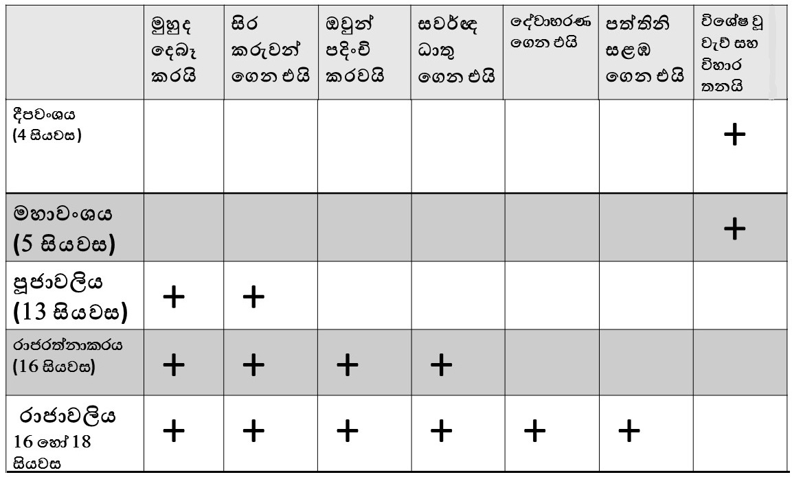 ගජබාහු සමඟ පත්තිනි පූජාව සම්බන්ධ කිරීමක් මෙන් ම හතර දේවාල ගැන ද පූජාවලියේ නොකියවෙන අතර, සිරකරුවන් විශේෂ වූ ස්ථානවල පදිංචි කරවූ බවක් හෝ මෙරටට ගෙනා සිරකරුවන්ගේ සංඛ්යාව ගැන හෝ කිසිම දෙයක් සඳහන් වන්නේ නැත. පූජාවලියේ හෝ 13 වැනි සියවසට අයිති එක ද සාහිත්ය කෘතියක හෝ පත්තිනි ඇදහිල්ලක් ගැන කියවෙන්නේ ද නැත. එහෙයින් වංසකථාවන්හි මේ පුරාණොක්තියේ වර්ධනය පහත දැක්වෙන වගුවෙන් දක්වන්නට පුළුවන.